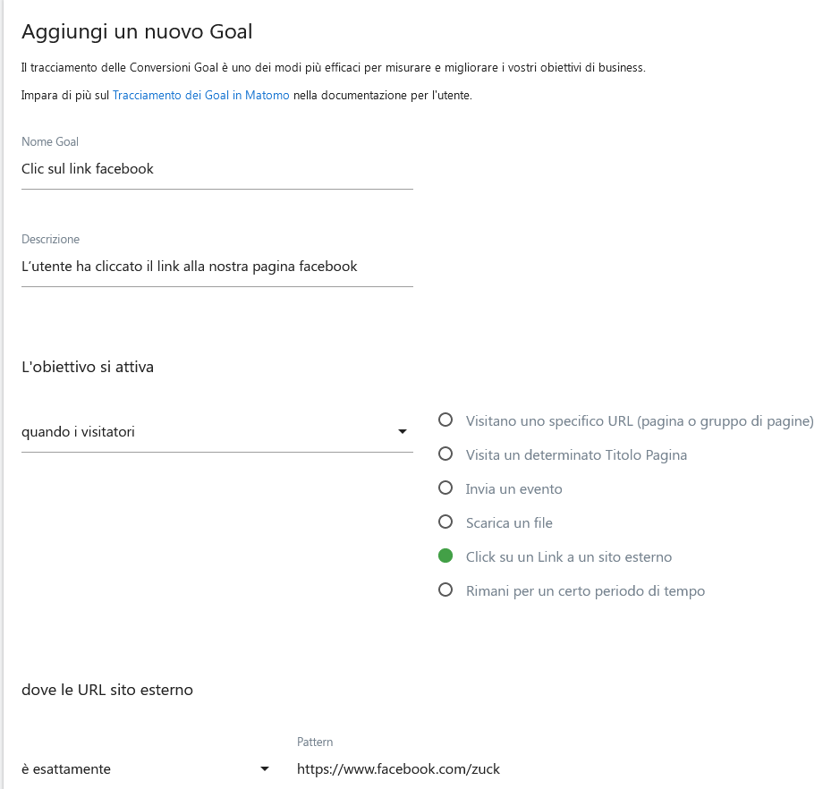 • Azione: L’obiettivo si attiva – quando i visitatori – click su un link a un sito esterno