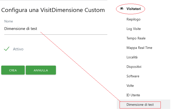 Possiamo infatti creare delle Dimensioni Visite che saranno visibili sotto a Visitatori, oppure delle Dimensioni Azione che saranno visibili sotto a Comportamento.