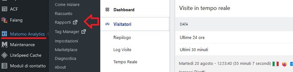 Menu di Matomo su WordPress e relativa dashboard